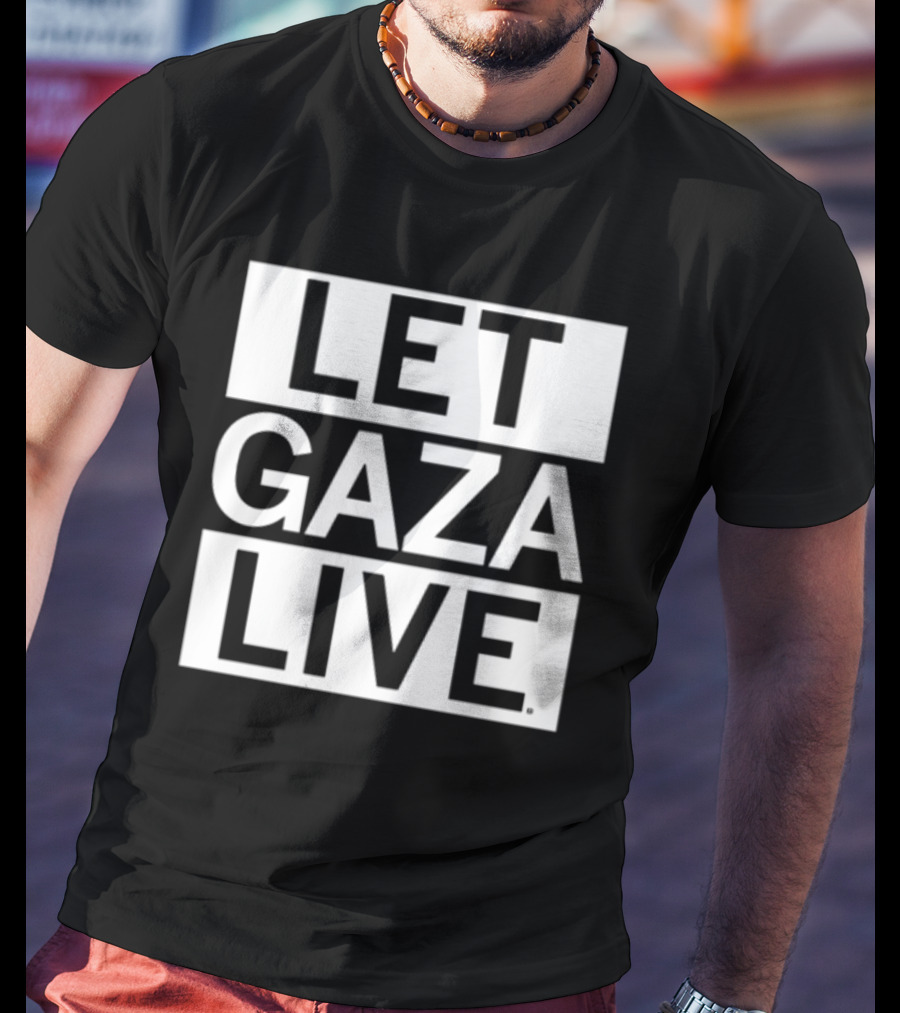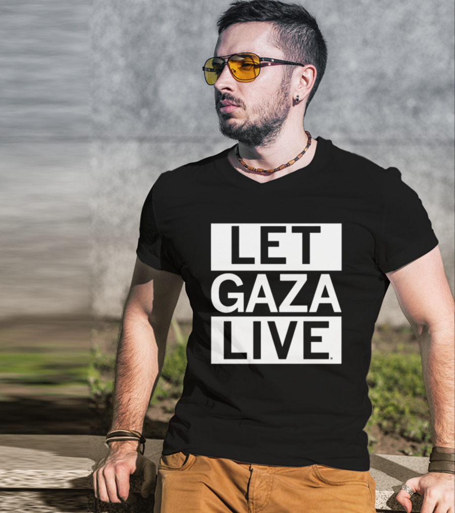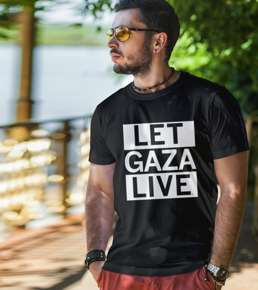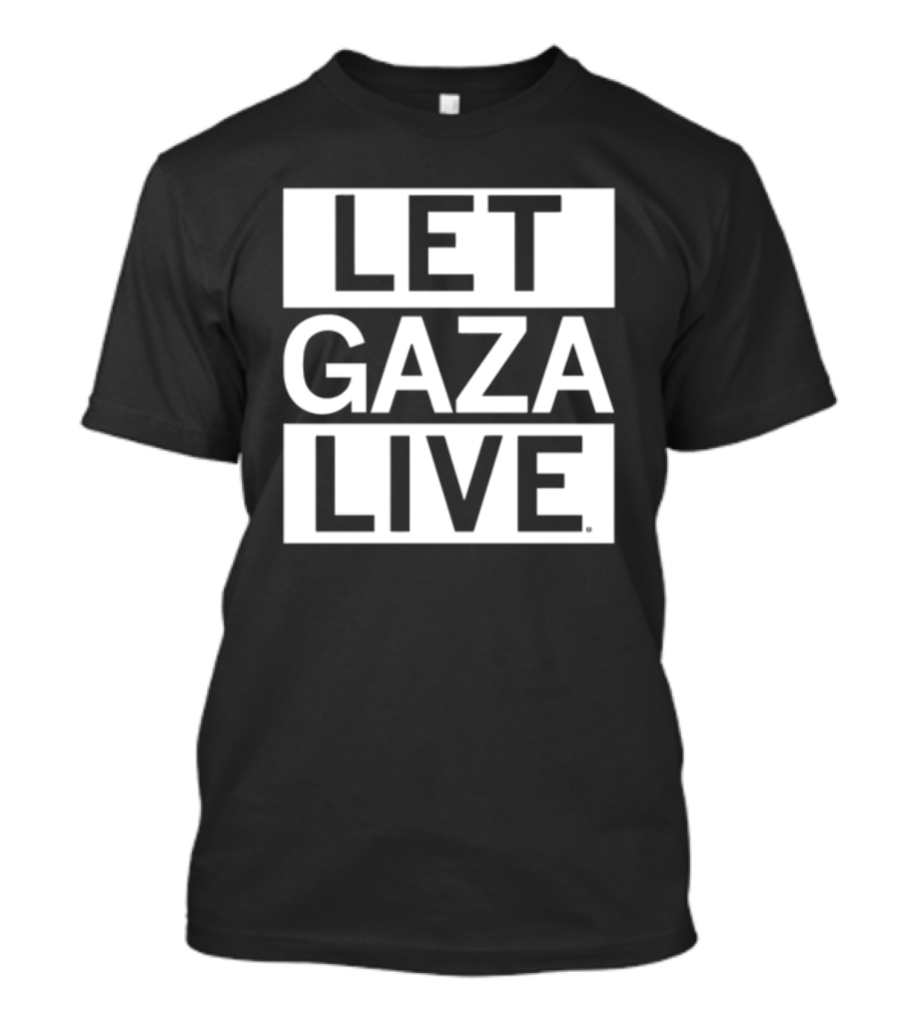 Raygun Let Gaza Live Bold Protest Message T-shirt — close-up view, front print.