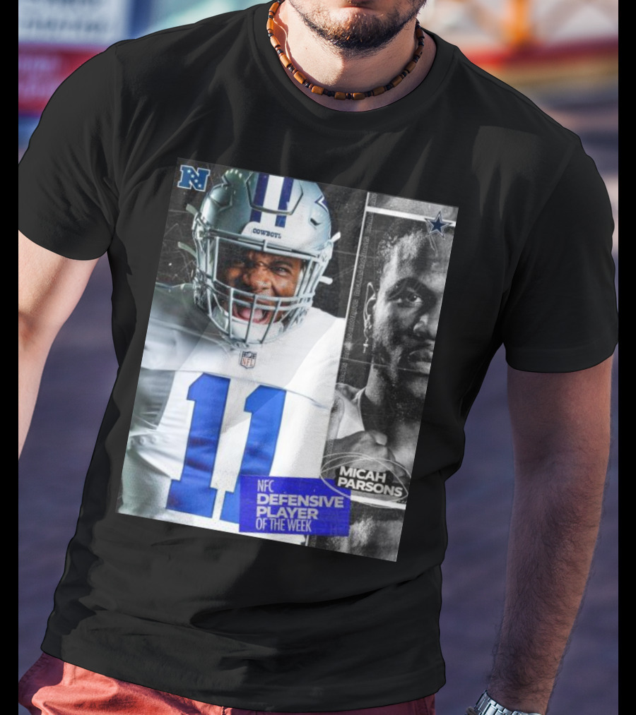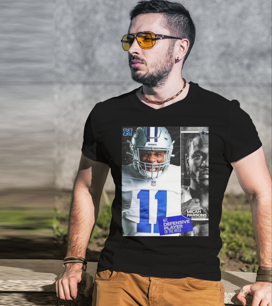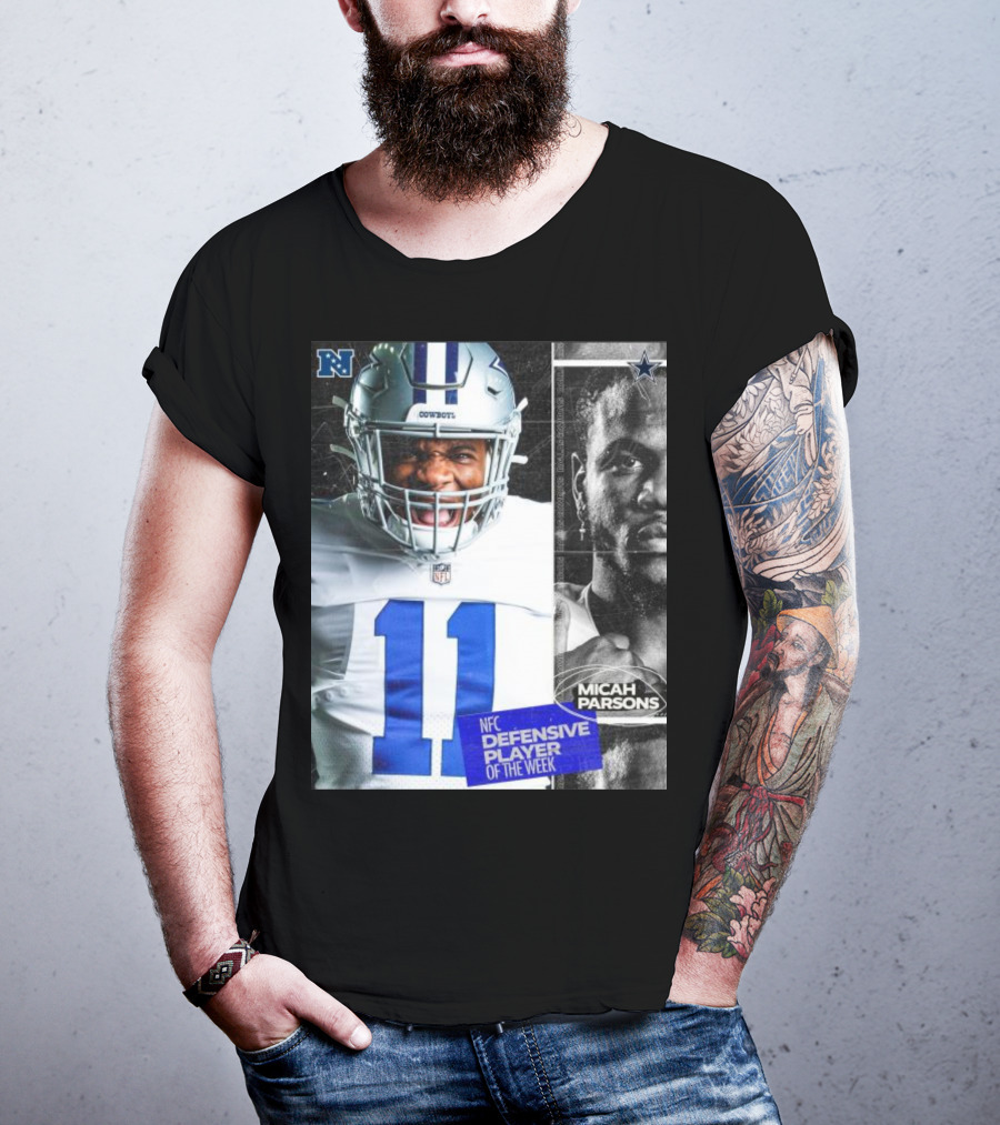 Meet the Dallas Cowboys 11 Micah Parsons NFC Defensive Player Of The Week T-Shirt. Made with 100% ring-spun cotton that's pre-shrunk to minimize shrinking after washing. Features reinforced construction for added structure. Available in standard U.S. sizes S-5XL (see size chart for specifics).