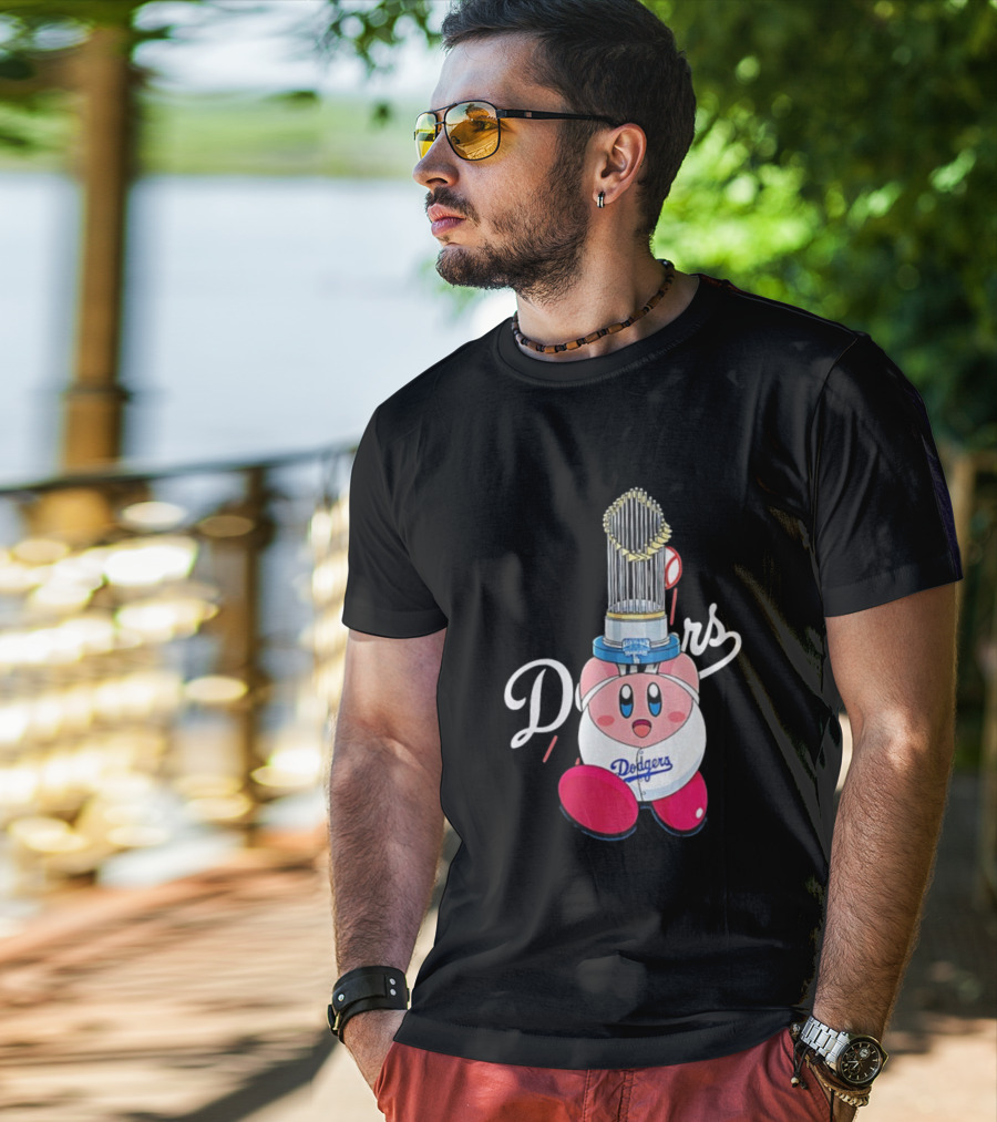 Meet the Kirby Dodgers Trophy World Series Champions MLB 2025 T-Shirt. Made with 100% ring-spun cotton that's pre-shrunk to minimize shrinking after washing. Features reinforced construction for added structure. Available in standard U.S. sizes S-5XL (see size chart for specifics).
