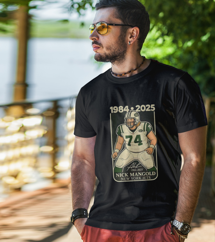 1984-2025 Nick Mangold 74 New York Jets Football Legend Signature T-shirt — close-up view, front print.