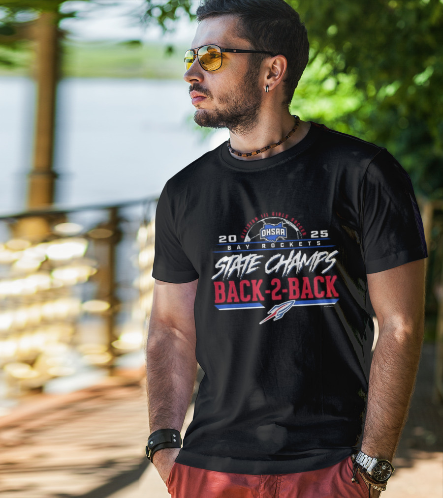 Bay Rockets 2023 2025 State Champs Back-2-Back OHSAA Girls Soccer Division 3 T-shirt — close-up view, front print.