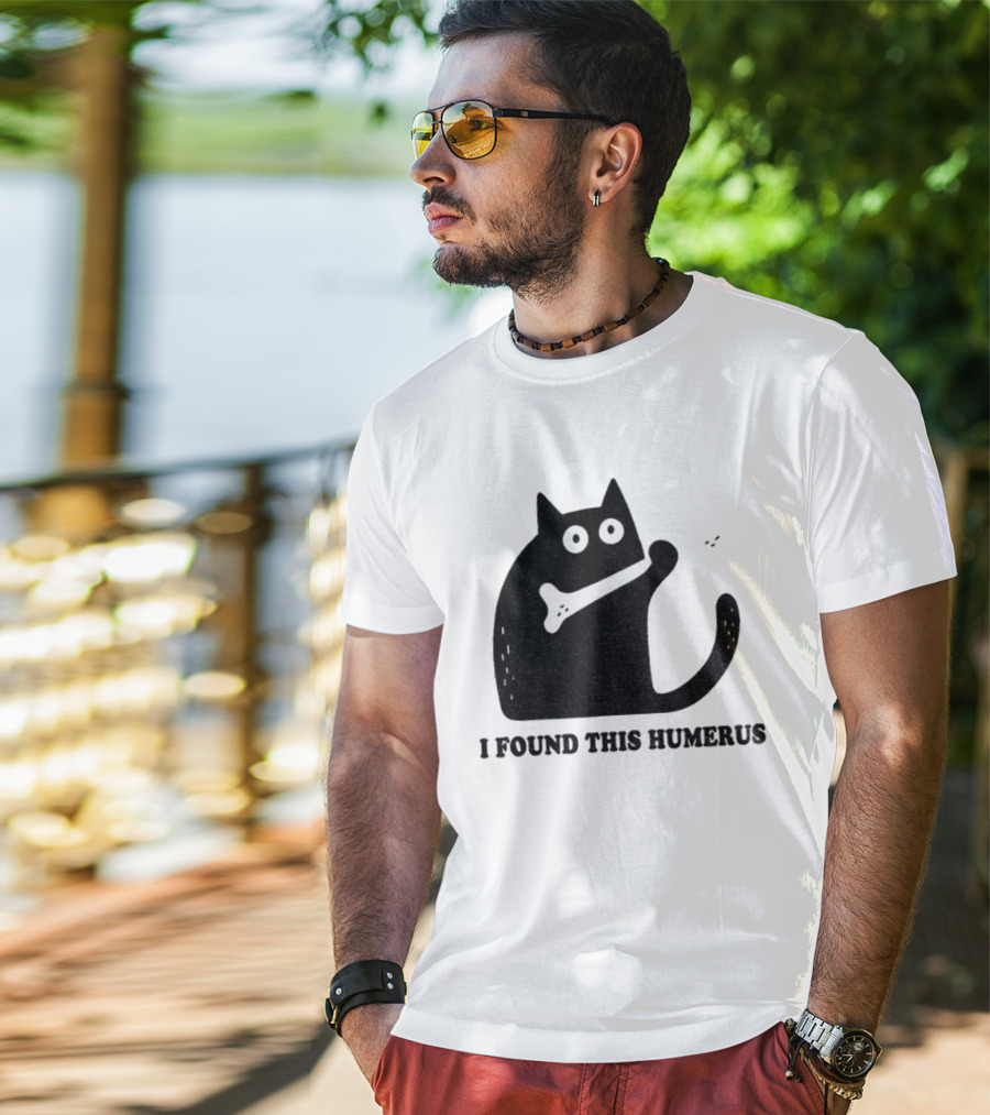 Meet the Black Cat I Found This Humerus Bone Joke T-Shirt. Made with 100% ring-spun cotton that's pre-shrunk to minimize shrinking after washing. Features reinforced construction for added structure. Available in standard U.S. sizes S-5XL (see size chart for specifics).