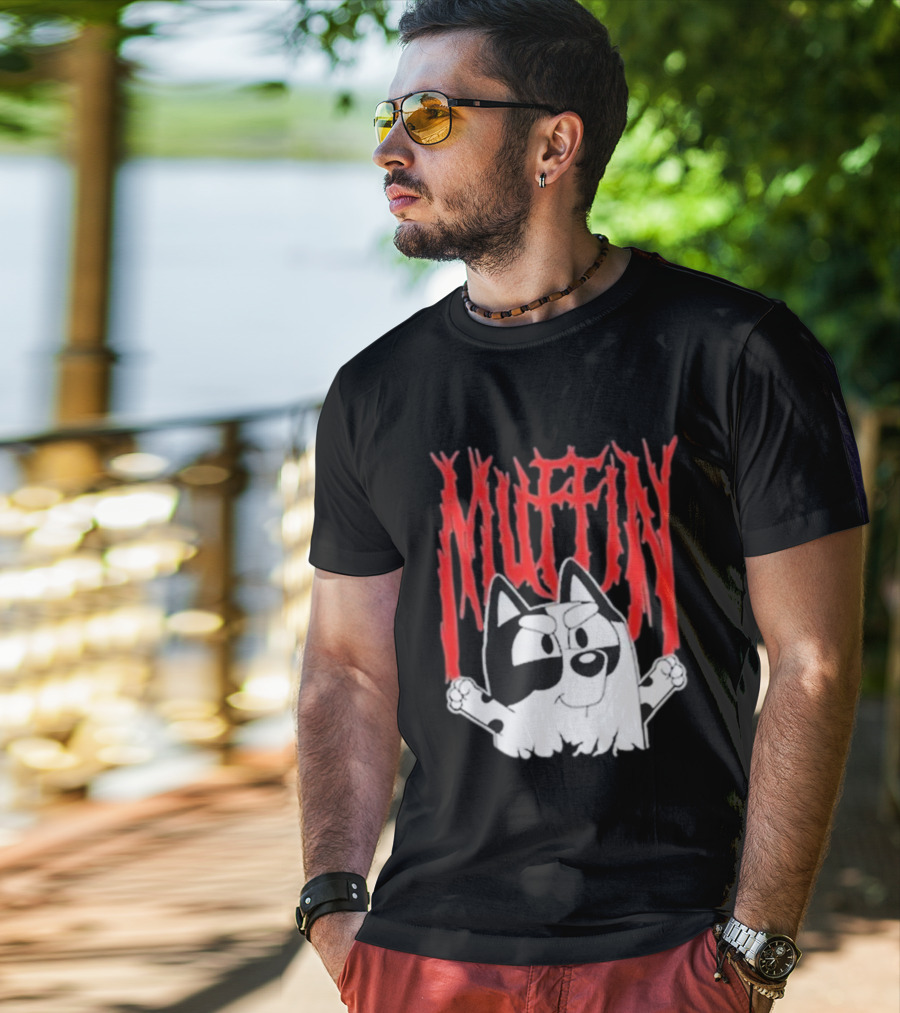 Meet the Bluey Muffin Metal Band Style T-Shirt. Made with 100% ring-spun cotton that's pre-shrunk to minimize shrinking after washing. Features reinforced construction for added structure. Available in standard U.S. sizes S-5XL (see size chart for specifics).