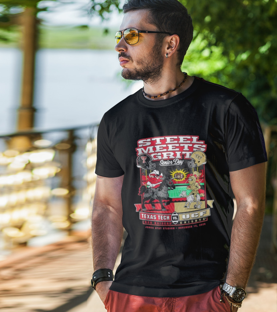 Steel Meets Grit Texas Tech Red Raiders vs UCF Knights Senior Day Jones AT&T Stadium Mascot November 15 2025 T-shirt — close-up view, front print.
