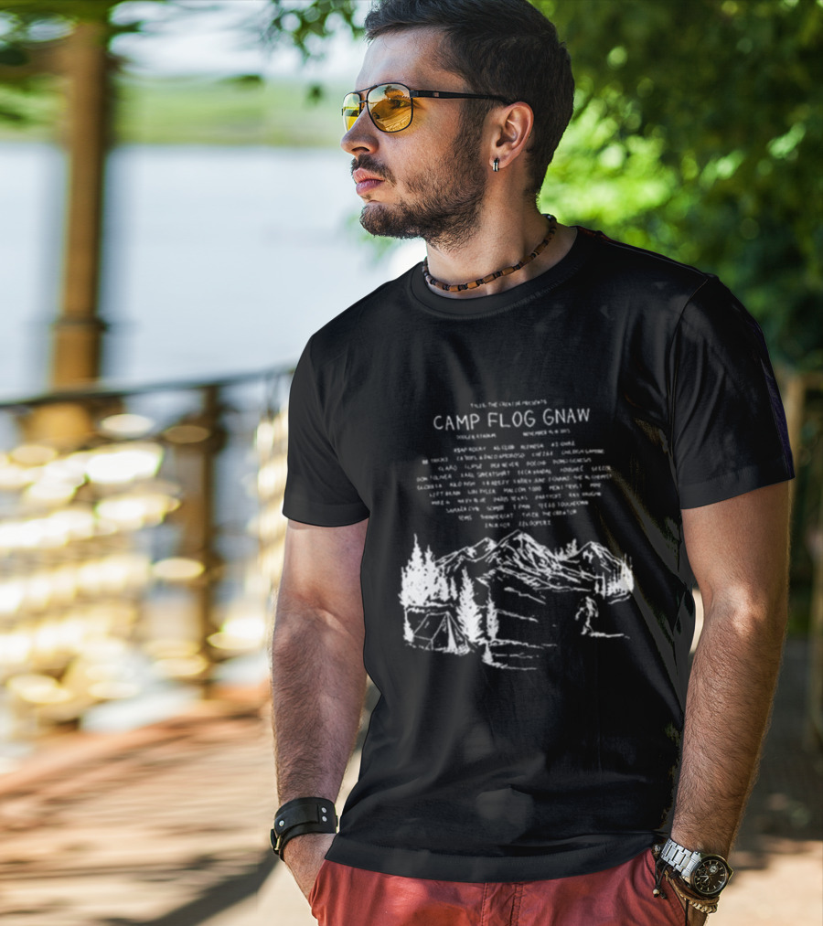 Meet the Camp Flog Gnaw 2025 Mountain Bigfoot Tyler the Creator Lineup Adventure T-Shirt. Made with 100% ring-spun cotton that's pre-shrunk to minimize shrinking after washing. Features reinforced construction for added structure. Available in standard U.S. sizes S-5XL (see size chart for specifics).