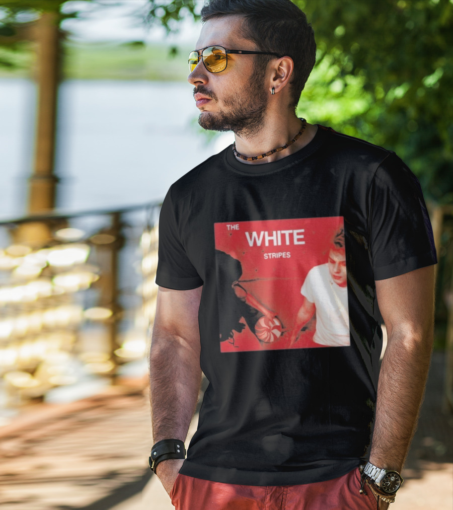 Meet the The White Stripes Let's Shake Hands Red and White Spiral Design T-Shirt. Made with 100% ring-spun cotton that's pre-shrunk to minimize shrinking after washing. Features reinforced construction for added structure. Available in standard U.S. sizes S-5XL (see size chart for specifics).