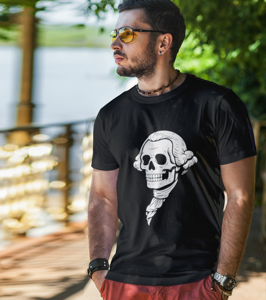 Meet the Poor Richard Monogram Skull Wig Icon T-Shirt. Made with 100% ring-spun cotton that's pre-shrunk to minimize shrinking after washing. Features reinforced construction for added structure. Available in standard U.S. sizes S-5XL (see size chart for specifics).