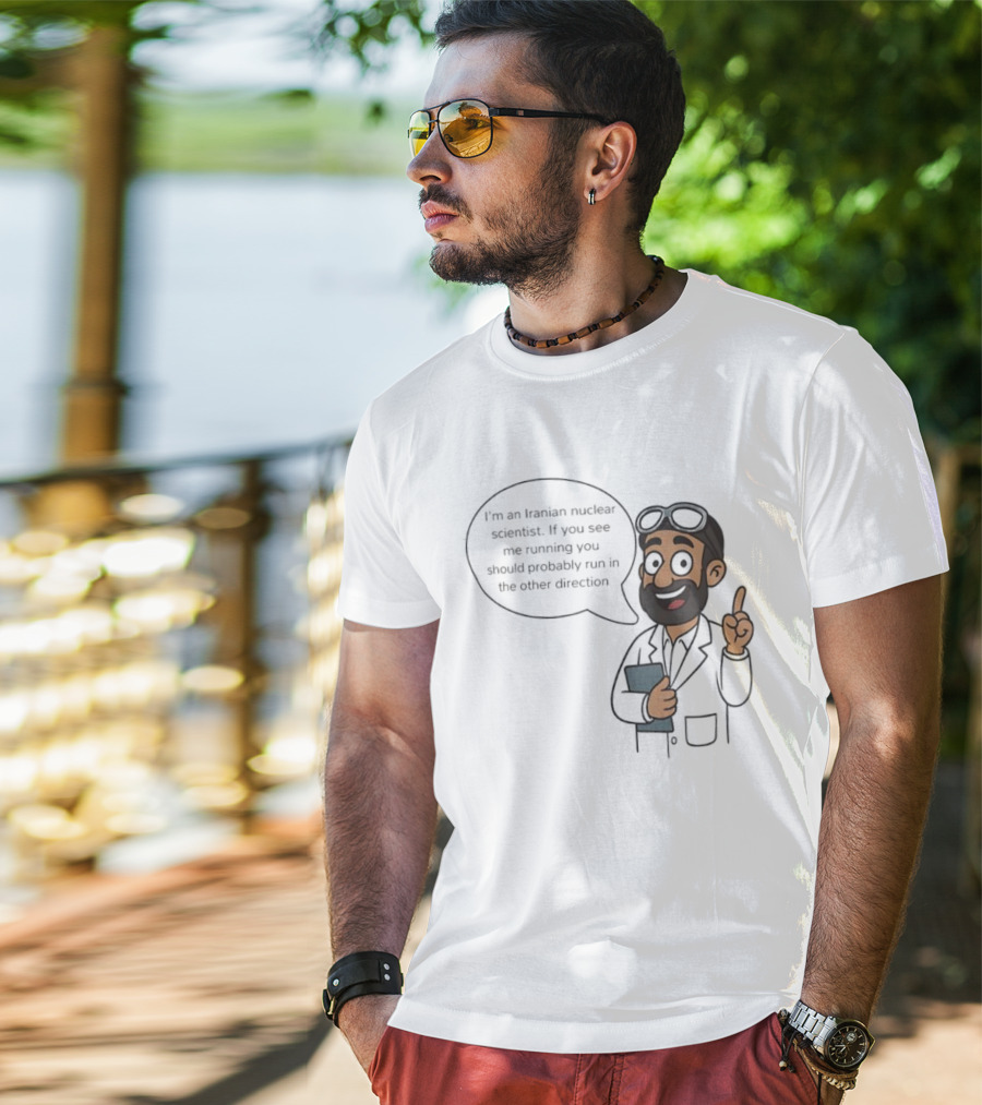 Meet the I'm an Iranian Nuclear Scientist Cartoon Humor Running Advice T-Shirt. Made with 100% ring-spun cotton that's pre-shrunk to minimize shrinking after washing. Features reinforced construction for added structure. Available in standard U.S. sizes S-5XL (see size chart for specifics).