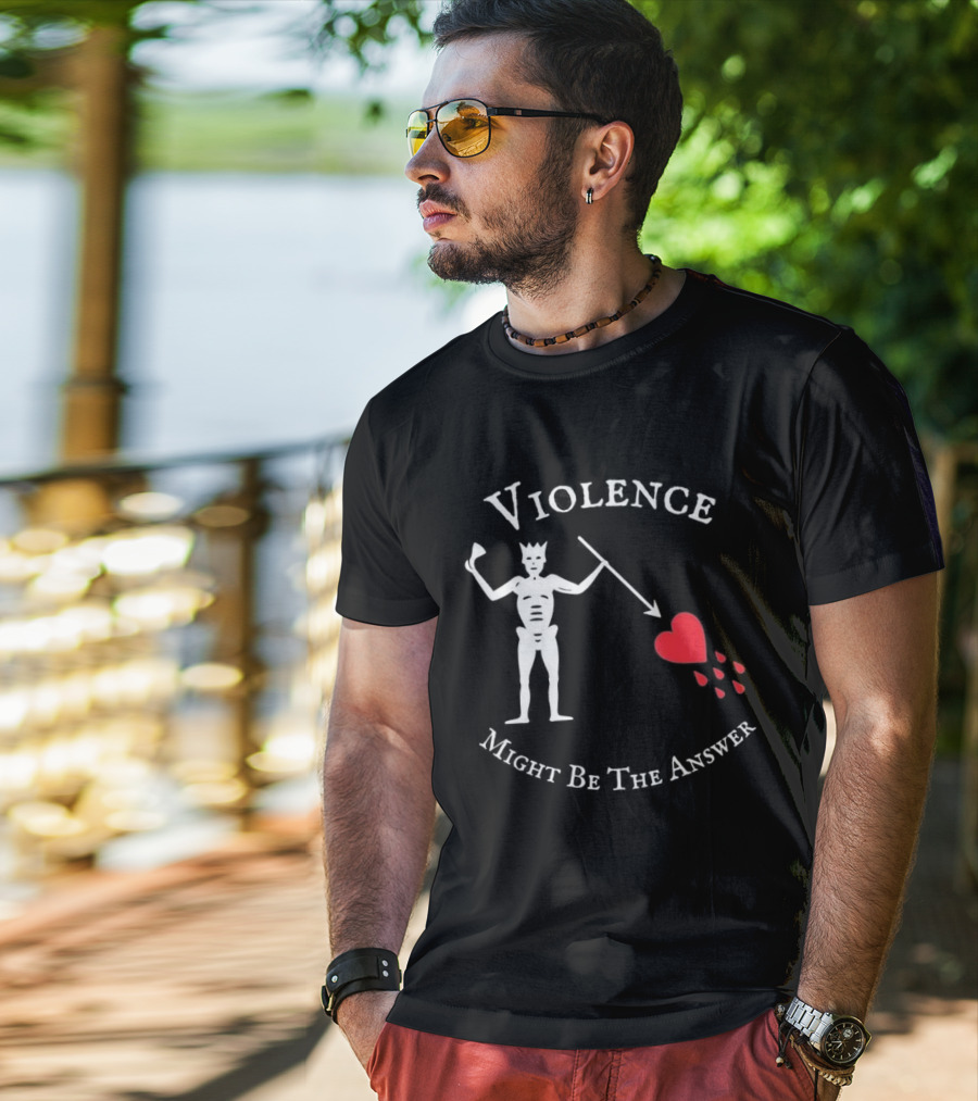 Meet the Violence Might Be the Answer Blackbeard Pirate Flag Skeleton with Heart and Blood Drops T-Shirt. Made with 100% ring-spun cotton that's pre-shrunk to minimize shrinking after washing. Features reinforced construction for added structure. Available in standard U.S. sizes S-5XL (see size chart for specifics).