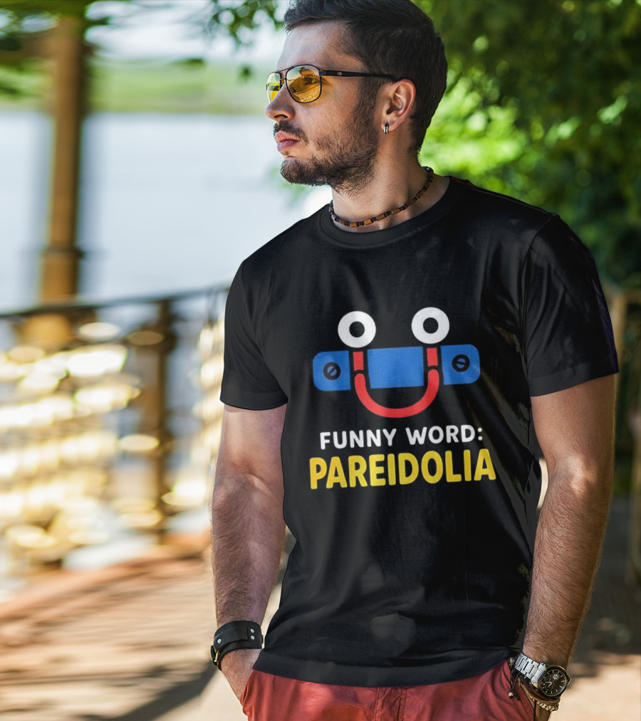Meet the Funny Word Pareidolia Smiling Face Design T-Shirt. Made with 100% ring-spun cotton that's pre-shrunk to minimize shrinking after washing. Features reinforced construction for added structure. Available in standard U.S. sizes S-5XL (see size chart for specifics).