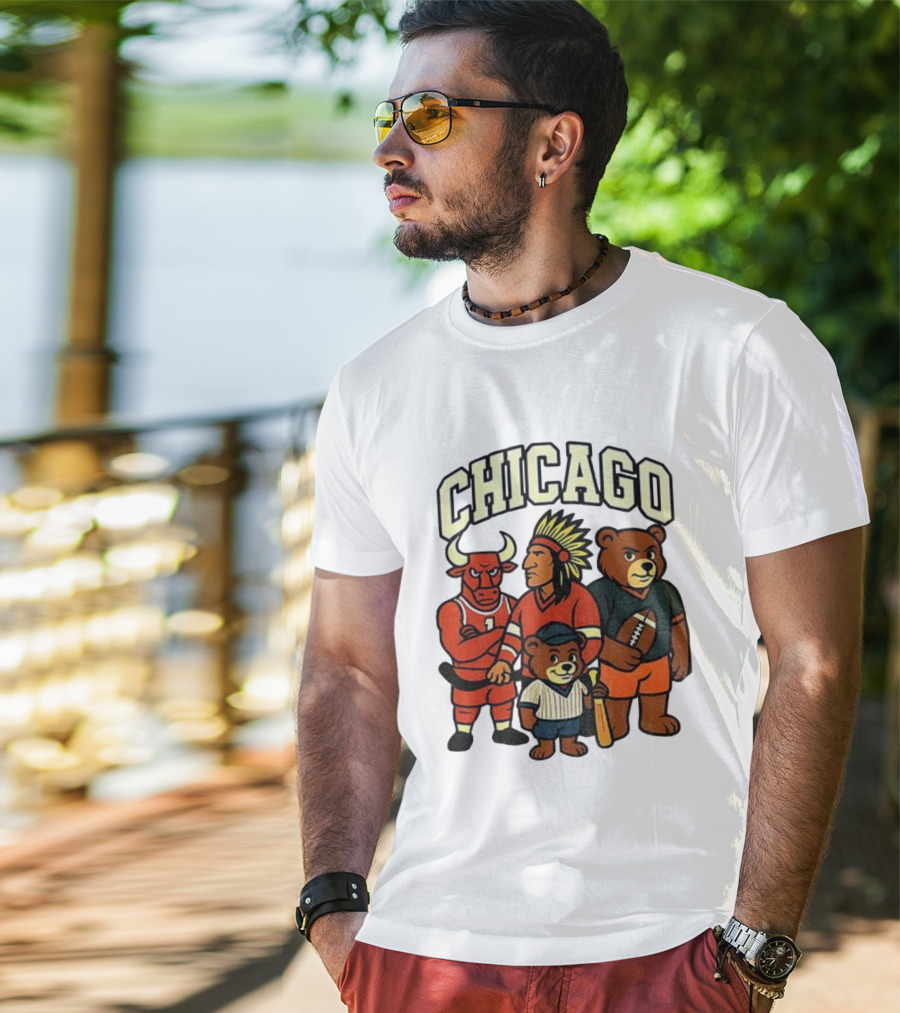 Meet the Chicago Bulls Blackhawks Bears Cubs Mascot Mashup T-Shirt. Made with 100% ring-spun cotton that's pre-shrunk to minimize shrinking after washing. Features reinforced construction for added structure. Available in standard U.S. sizes S-5XL (see size chart for specifics).