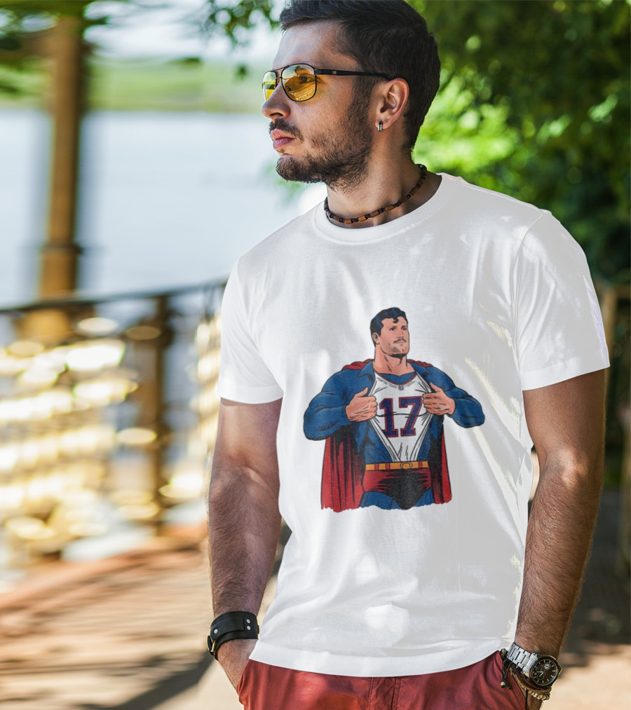 Meet the Josh Allen Superhero 17 Buffalo Bills NFL MVP Cartoon T-Shirt. Made with 100% ring-spun cotton that's pre-shrunk to minimize shrinking after washing. Features reinforced construction for added structure. Available in standard U.S. sizes S-5XL (see size chart for specifics).