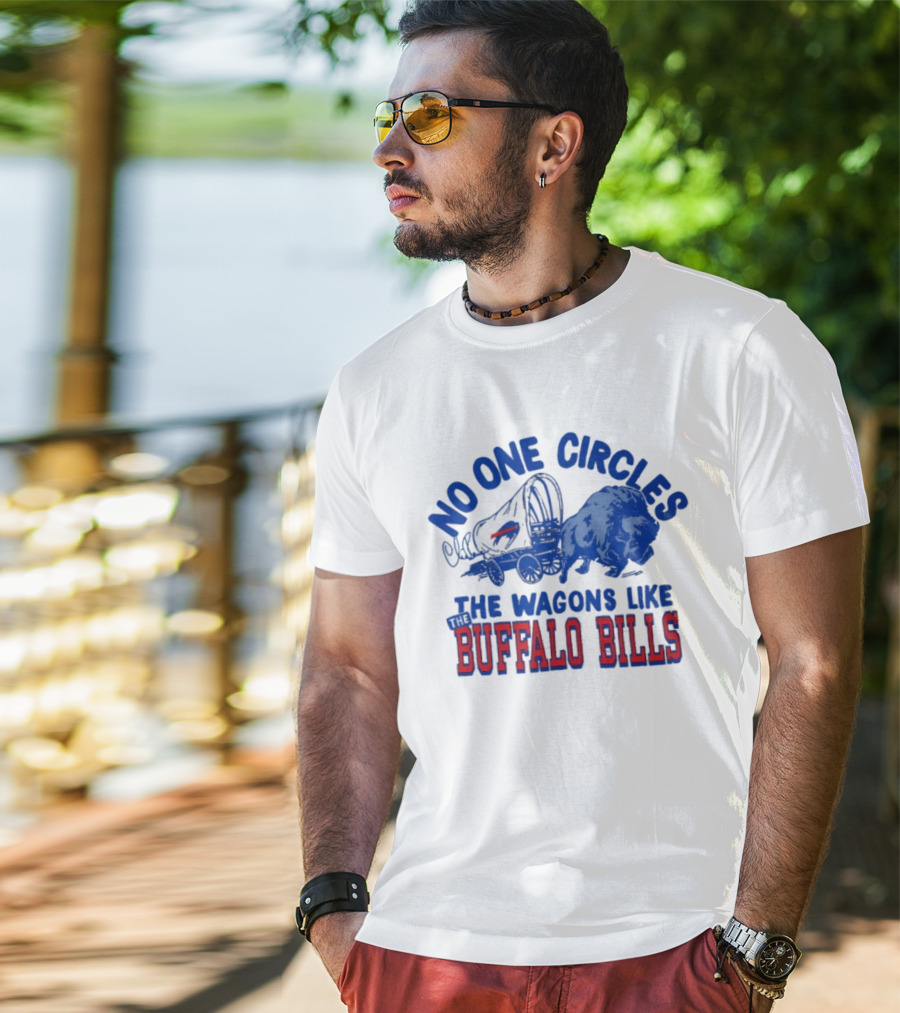 Meet the No One Circles the Wagons Like Buffalo Bills Team Spirit T-Shirt. Made with 100% ring-spun cotton that's pre-shrunk to minimize shrinking after washing. Features reinforced construction for added structure. Available in standard U.S. sizes S-5XL (see size chart for specifics).