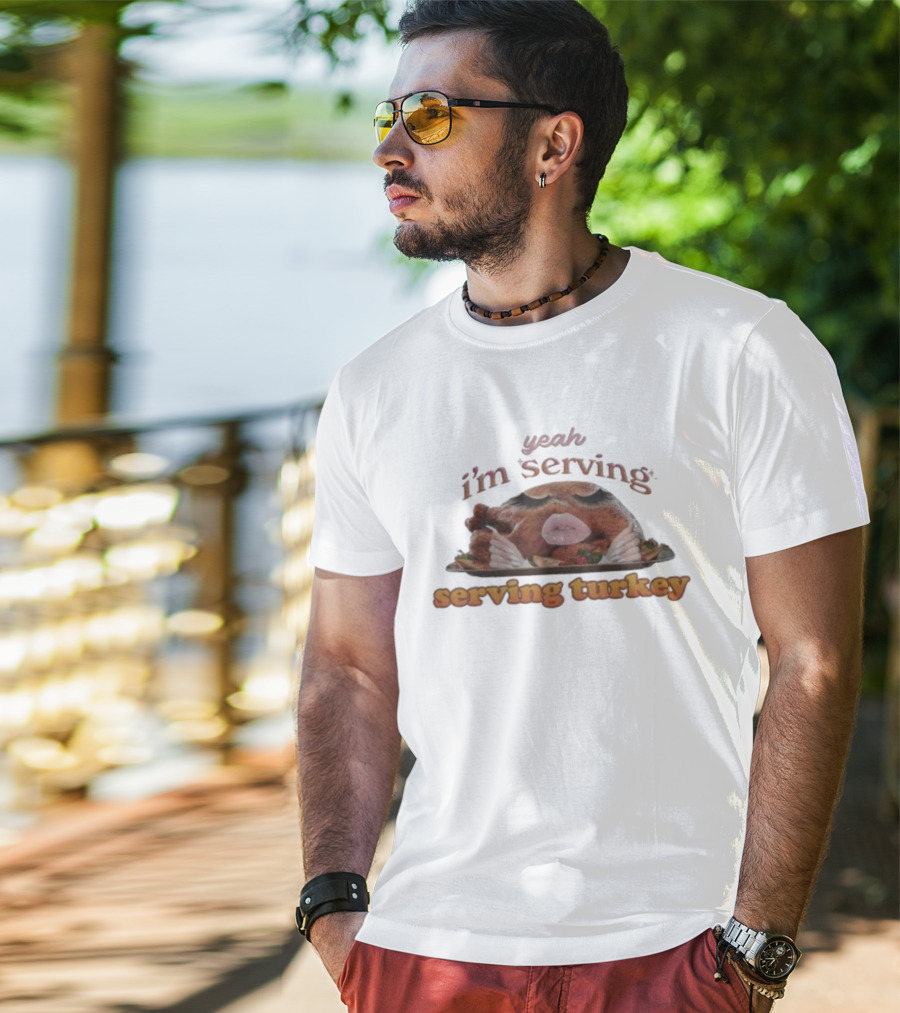 Meet the Yeah I'm Serving Turkey Thanksgiving Hands Slay T-Shirt. Made with 100% ring-spun cotton that's pre-shrunk to minimize shrinking after washing. Features reinforced construction for added structure. Available in standard U.S. sizes S-5XL (see size chart for specifics).