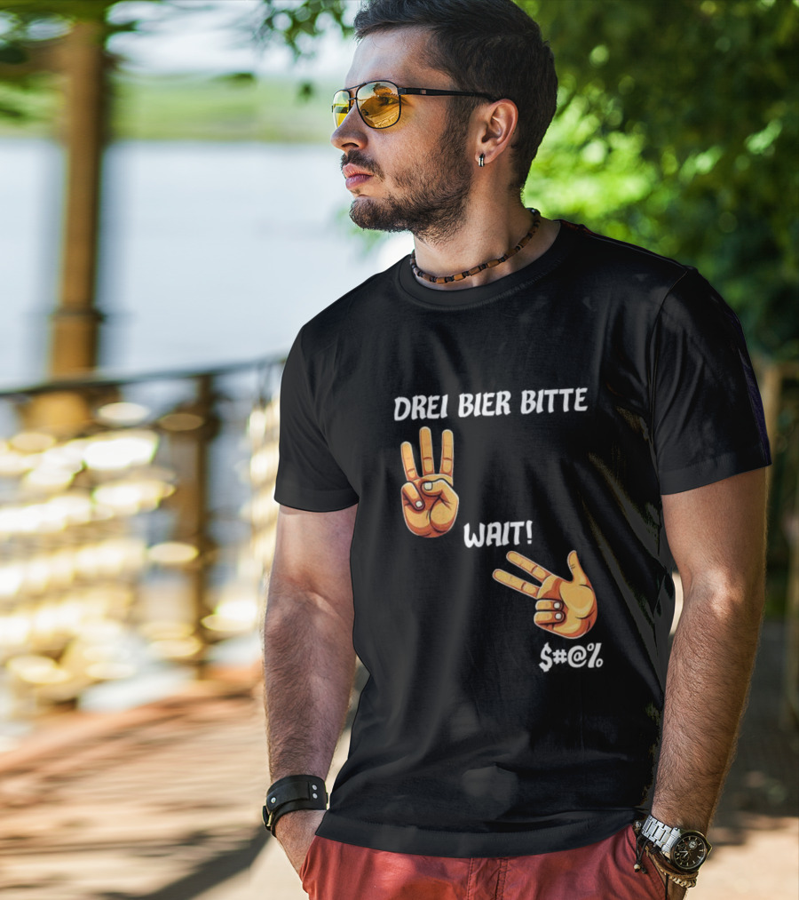 Drei Bier Bitte Hand Gesture Three Wait Three Beers T-shirt — close-up view, front print.