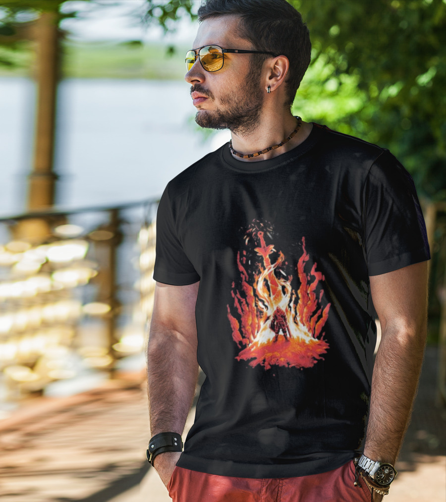 Images Gallery — Dark Souls Trial By Fire Warrior Surrounded by Flames Iconic Gaming Imagery Shirt Mockups Collection