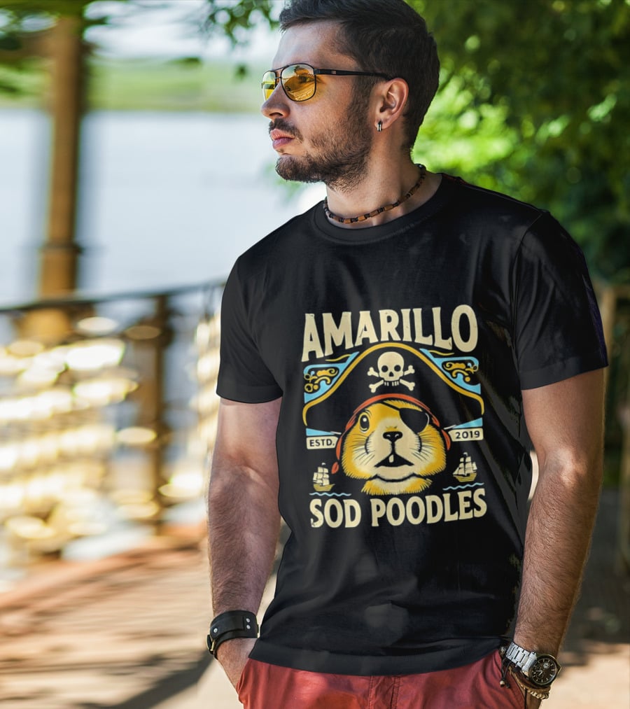 Meet the Amarillo Sod Poodles Pirate Prairie Dog Estd 2019 T-Shirt. Made with 100% ring-spun cotton that's pre-shrunk to minimize shrinking after washing. Features reinforced construction for added structure. Available in standard U.S. sizes S-5XL (see size chart for specifics).