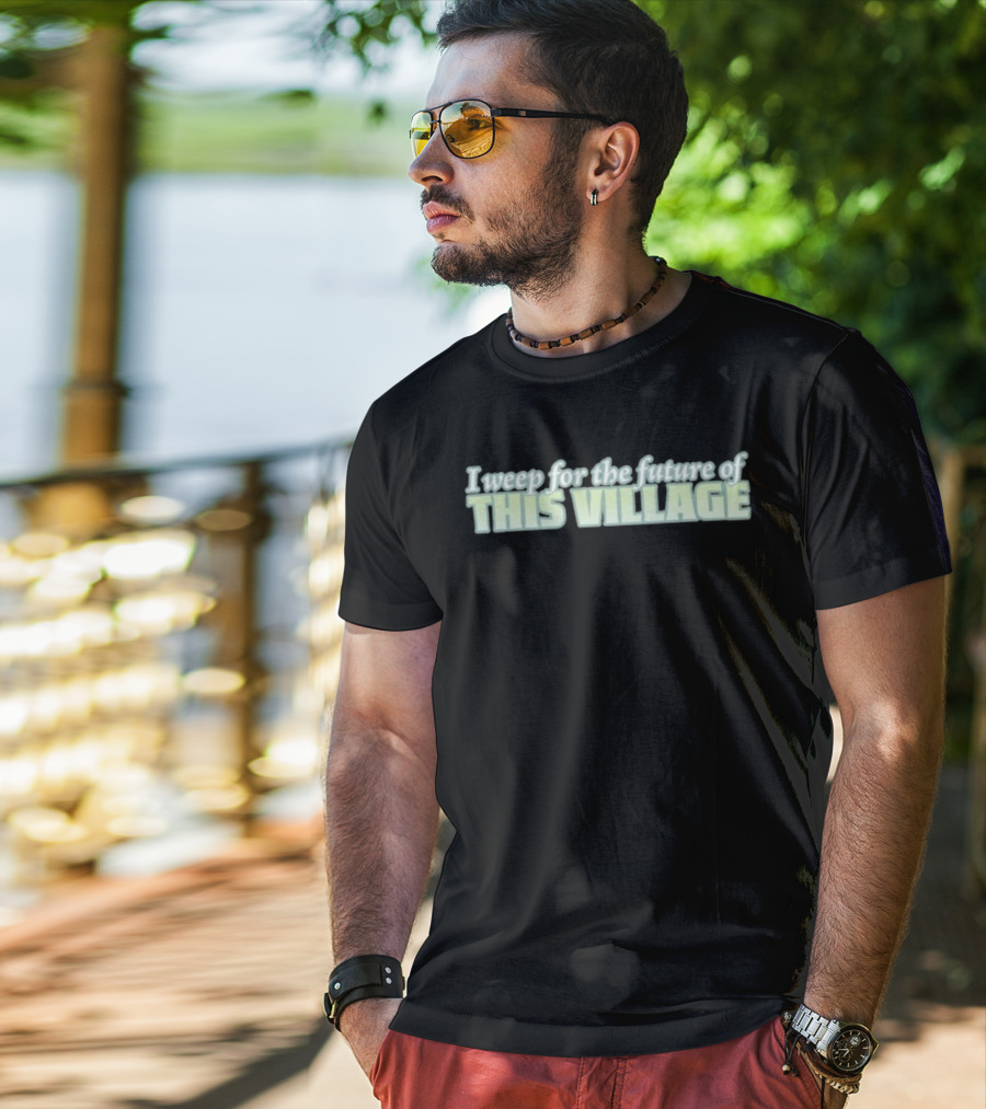 Meet the Alexnorimaki I Weep for the Future of This Village Text T-Shirt. Made with 100% ring-spun cotton that's pre-shrunk to minimize shrinking after washing. Features reinforced construction for added structure. Available in standard U.S. sizes S-5XL (see size chart for specifics).