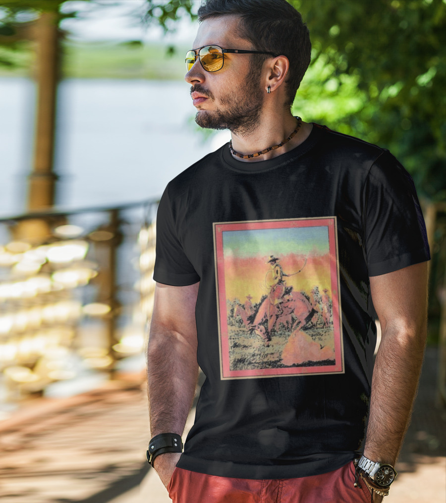 Arizona Cowboy Western Rodeo Sunset Scene Rustic Art T-shirt — close-up view, front print.