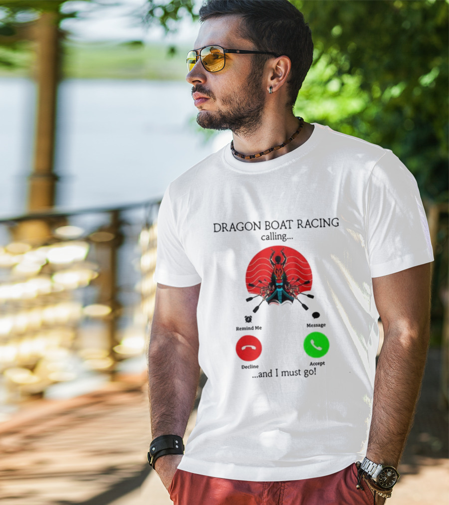 Images Gallery — Dragon Boat Racing Calling I Must Go Phone Display with Paddles and Symbols Shirt Mockups Collection