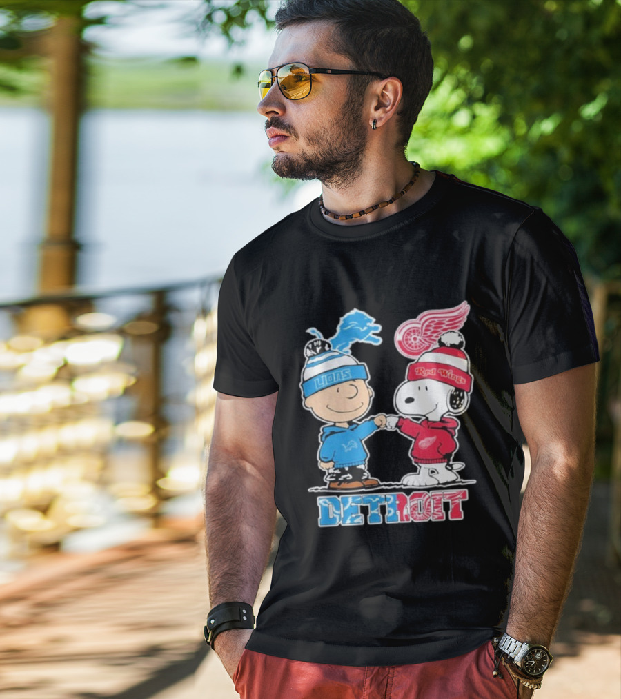Detroit Snoopy Peanuts Fan Lions Red Wings Christmas T-shirt — close-up view, front print.