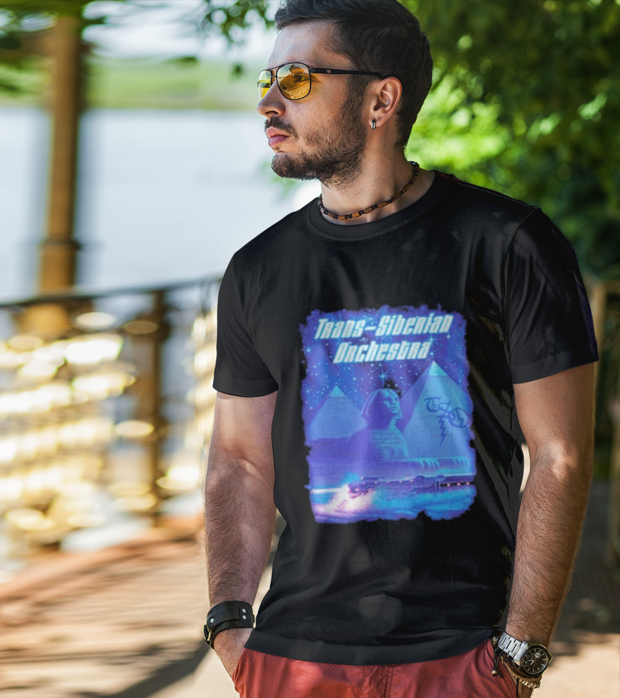 Meet the Trans-Siberian Orchestra Sphynx Train Pyramids Lightning Guitar Scene T-Shirt. Made with 100% ring-spun cotton that's pre-shrunk to minimize shrinking after washing. Features reinforced construction for added structure. Available in standard U.S. sizes S-5XL (see size chart for specifics).