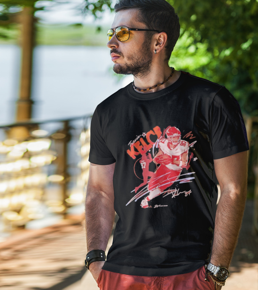 Meet the Travis Kelce Kansas City Chiefs 87 Scribble Signature T-Shirt. Made with 100% ring-spun cotton that's pre-shrunk to minimize shrinking after washing. Features reinforced construction for added structure. Available in standard U.S. sizes S-5XL (see size chart for specifics).