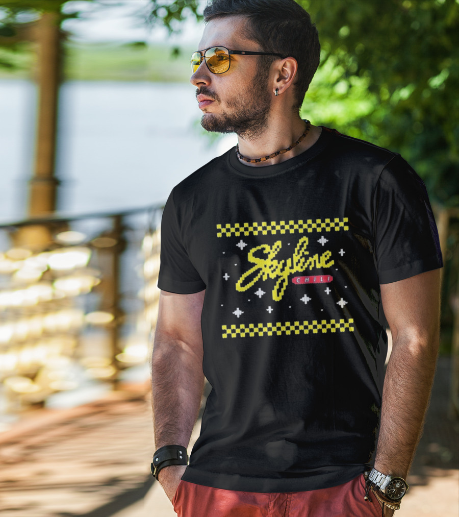 Meet the Skyline Chili Christmas Knit Style Retro Festive Checkerboard Snowflakes T-Shirt. Made with 100% ring-spun cotton that's pre-shrunk to minimize shrinking after washing. Features reinforced construction for added structure. Available in standard U.S. sizes S-5XL (see size chart for specifics).