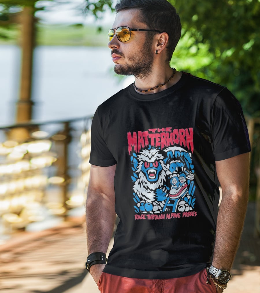 The Matterhorn Yeti Adventure Race Through Alpine Passes T-shirt — close-up view, front print.